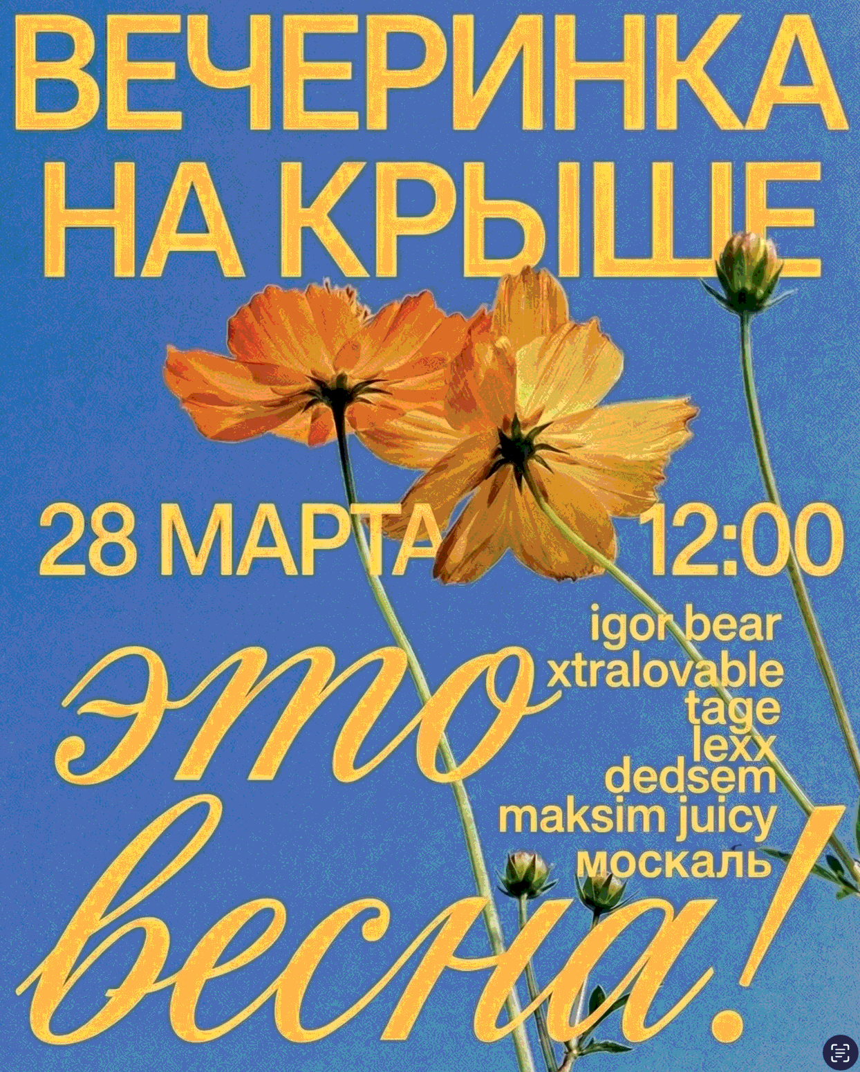 Дневная вечеринка под открытым небом. Солнце, музыка и тот самый вайб, ради которого выходят из дома. Первый час — DJ и живая музыка,